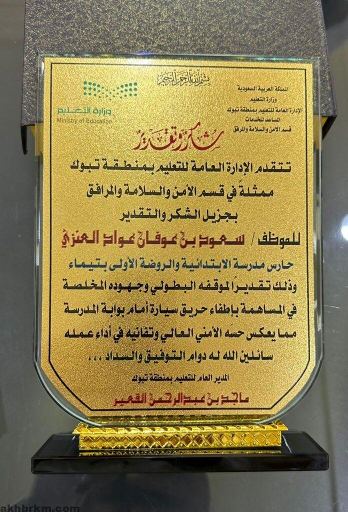 نقل المدير العام للتعليم بمنطقة تبوك ماجد بن عبدالرحمن القعير شكر وتقدير معالي وزير التعليم للموظف / سعود بن عوفان العنزي حارس مدرسة الابتدائية والروضة الأولى بتيماء؛ وذلك نظير موقفه البارز وجهوده المخلصة في المساهمة بإطفاء حريق مفاجئ لسيارة توقفت أمام بوابة المدرسة بالتعاون مع إدارة المدرسة وأولياء الأمور وإبلاغ الدفاع المدني؛ وثمن مدير التعليم جهود حارس المدرسة وسرعة تصرفه ما يعكس حسه المسؤول وتفانيه في أداء عمله؛ جاء ذلك خلال استقباله و تكريمه لحارس المدرسة بحضور المساعد للخدمات محمد شاطري ومنسوبي الأمن والسلامة بتعليم تبوك.
