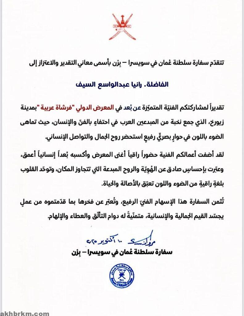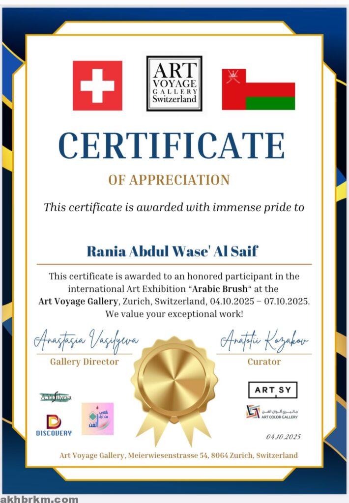 تقدم سفارة سلطنة عمان في سويسرا برن شهادة تكريم للفنانة التشكيلية رانيا عبدالواسع السيف