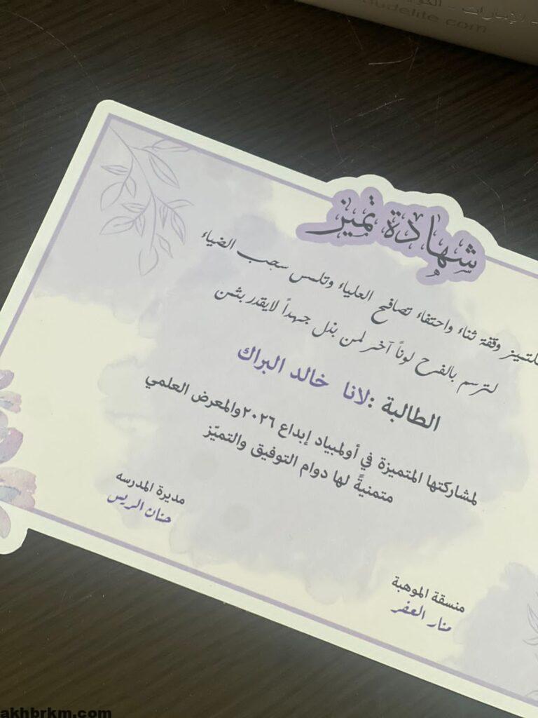 وذكرت مديرة المدرسة الأستاذة حنان فرحان الريس انه انطلاقًا من حرص المدرسة على تنمية الإبداع والابتكار لدى الطالبات، ومواكبة لرؤية المملكة 2030 التي تدعم الموهبة والابتكار، شاركت الطالبة (لانا خالد البراك) في معرض إبداع 2026 مقدمة فكرة متميزة تعبّر عن طموحها العلمي وقدرتها على التفكير الابتكاري باشراف منسقة موهبة الأستاذة منار العفر لتميز مشاركتها الفاعلة والمشرّفة في معرض إبداع 2026 .