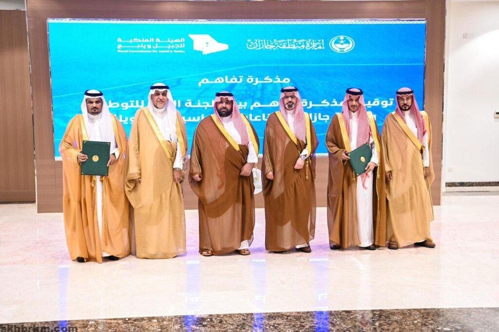 شهد صاحب السمو الملكي الأمير محمد بن عبدالعزيز بن محمد بن عبدالعزيز أمير منطقة جازان، وبحضور صاحب السمو الأمير ناصر بن محمد بن عبدالله بن جلوي نائب أمير المنطقة، ومعالي رئيس الهيئة الملكية للجبيل وينبع المهندس خالد السالم, اليوم، مراسم توقيع مذكرة تفاهم بين مدينة جازان للصناعات الأساسية والتحويلية واللجنة العليا للتوطين في المنطقة.