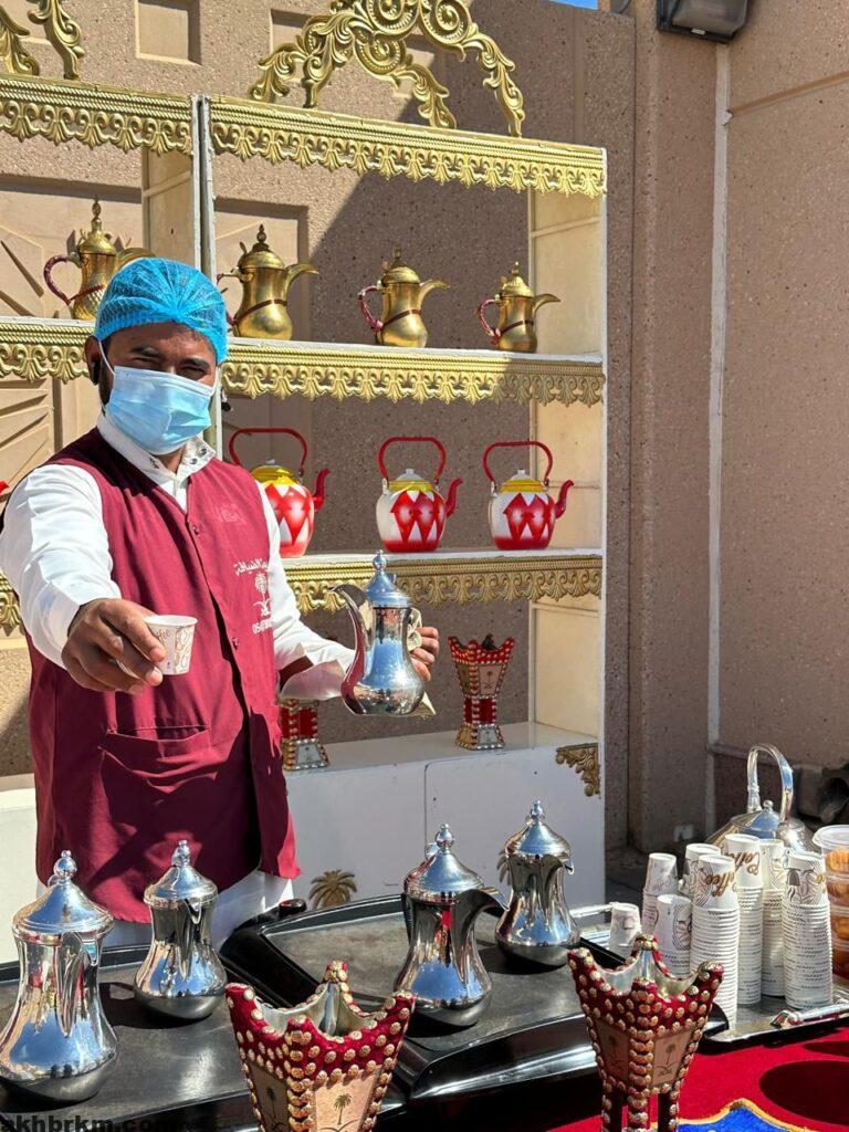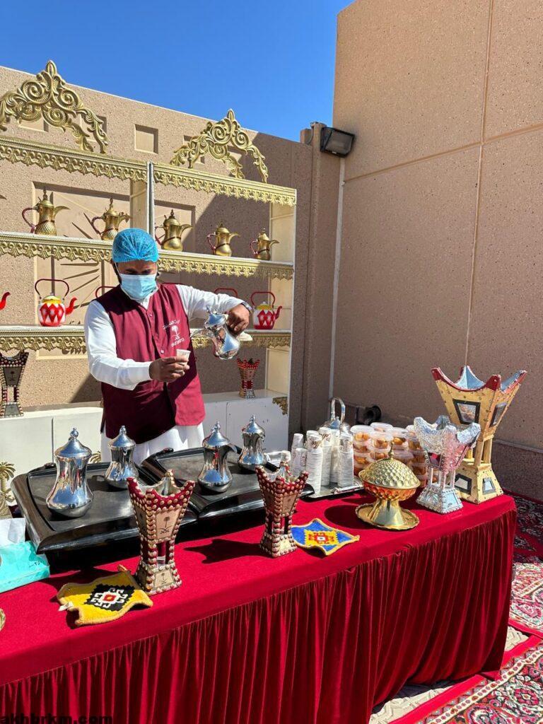 وذلك داخل اروقة الكلية الجامعية عن طريق إقامة ركن وعربة لتقديم القهوه السعودية بموروثها الأصيل المرتبط بهوية وثقافة المملكة وبتاريخها الذي يختزل عادات وتقاليد وثقافات تبرز كرم الضيافه السعودية الاصيله