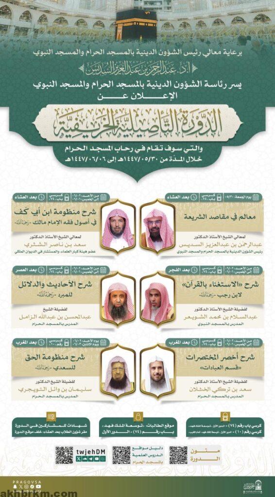 ويشارك في الدورة نخبة من أصحاب المعالي والفضيلة ومدرسي الحرمين الشريفين، وتأتي هذه الدورة برعاية معالي رئيس الشؤون الدينية بالمسجد الحرام والمسجد النبوي الشيخ الأستاذ الدكتور عبدالرحمن بن عبدالعزيز السديس، تأكيدًا لاهتمام الرئاسة بتعزيز البرامج العلمية وتحقيق رسالتها في خدمة العلم الشرعي.
