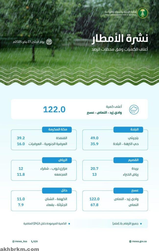 وفقًا للتقرير اليومي الصادر عن وزارة البيئة والمياه والزراعة، شمل التقرير هطول الأمطار عبر (140) محطة هيدرولوجية ومناخية، وذلك خلال الفترة من الساعة التاسعة صباح يوم الأحد 26 يناير حتى الساعة التاسعة صباح يوم الاثنين 27 يناير 2025م في (9) مناطق بالمملكة هي (الرياض- مكة المكرمة- المدينة المنورة- القصيم- الشرقية- عسير- حائل- نجران- الباحة)