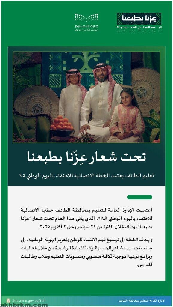 اعتمدت الإدارة العامة للتعليم بمحافظة الطائف خطتها الاتصالية للاحتفاء باليوم الوطني 95 تحت شعار “عزنا بطبعنا