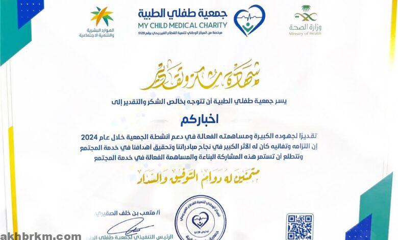 كرّم الرئيس التنفيذي لجمعية طفلي الطبية، الأستاذ متعب بن خلف الصقيري، صحيفة “أخباركم الإعلامية،
