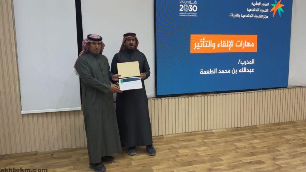وفي نهاية الدورة قدم سعادة مدير مركز التنمية الاجتماعية بالقريات شكره وتقديره للمدرب على المساهمة بتنمية المجتمع من خلال تعاونه مع المركز