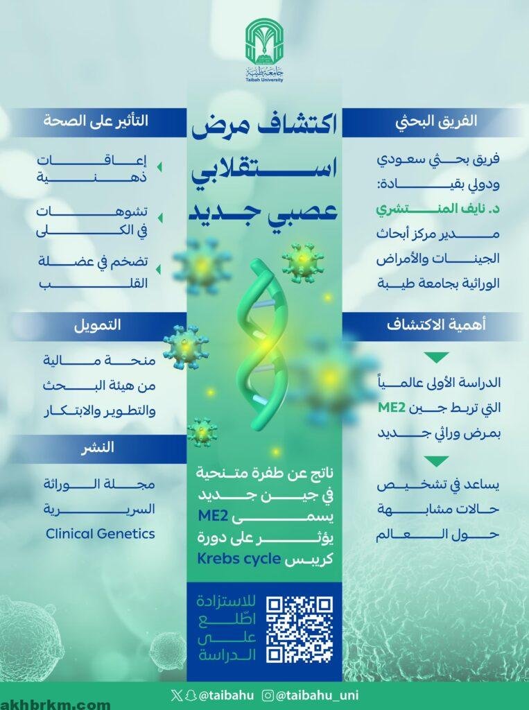 أعلن فريق بحثي يضم باحثين سعوديين وعلماء دوليين بقيادة الدكتور نايف المنتشري مدير مركز أبحاث الجينات والأمراض الوراثية في جامعة طيبة عن اكتشاف مرض جيني جديد يتمثل في طفرة نادرة في جين ME2 المرتبط بدورة كريبس Krebs cycle.