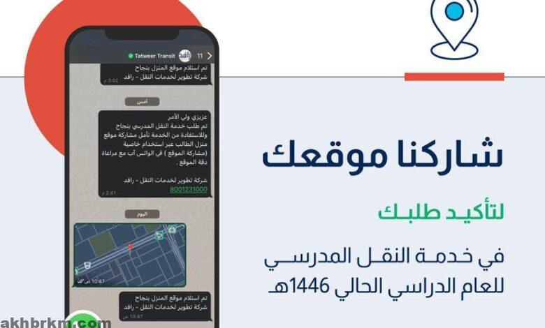 دعت شركة تطوير لخدمات النقل “رافد”، أولياء الأمور بمشاركة موقع منزل الطالب المسجل في خدمة النقل المدرسي للعام الدراسي الحالي 1446هـ، لتأكيد الطلب.وأضافت “رافد”: في حال تلقّيكم رسالة من حساب الشركة الموثّق على تطبيق “واتساب”، نأمل مشاركتنا موقع المنزل للطالب المسجل في الخدمة؛ لاستكمال إجراءات تقديم خدمة النقل المدرسي للعام الدراسي الحالي 1446هـ.
