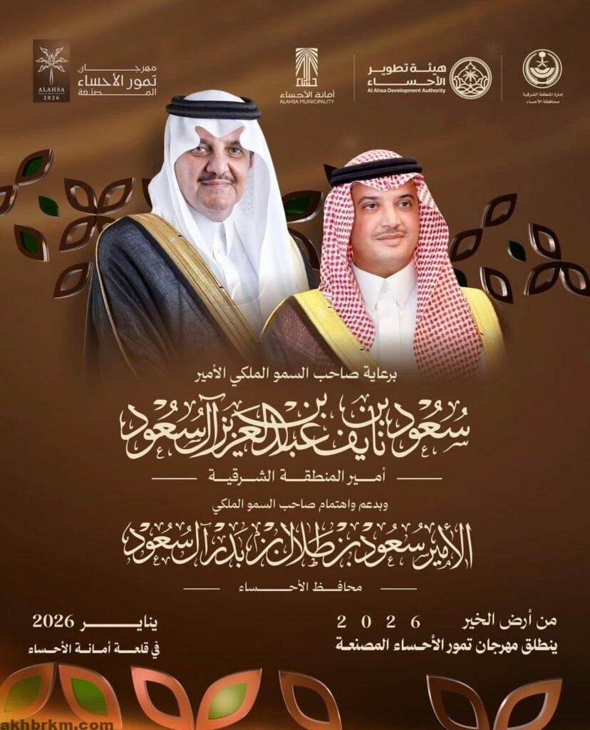 ويُقام المهرجان في قلعة أمانة الأحساء ابتداءً من يناير 2026، بتنظيم مشترك بين أمانة الأحساء وهيئة تطوير الأحساء، وبمشاركة فاعلة من الجهات الحكومية والقطاع الخاص، ضمن جهود متكاملة تهدف إلى دعم المزارعين، وتحفيز الصناعات التحويلية للتمور، وتعزيز القيمة المضافة للمنتج المحلي.