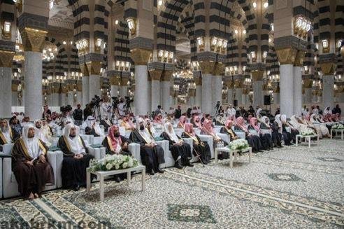 واستهلت فقرات الحفل، بتلاوة آيات من القرآن الكريم، ثم استمع الحضور إلى كلمة سماحة مفتي عام المملكة الشيخ عبدالعزيز بن عبدالله بن محمد آل الشيخ، ألقاها نيابة عن سماحته، معالي الأمين العام لهيئة كبار العلماء الشيخ الدكتور فهد الماجد، وأوضحت الكلمة ملامح من قصة هجرة النبي -صلّى الله عليه وسلّم- من مكة وقدومه المدينة المنورة وبنائه مسجده الشريف وما تتابع عليه من التوسعات، كان أعظمها وأكبرها ما تَمَّ في العهد السعودي المبارك.
