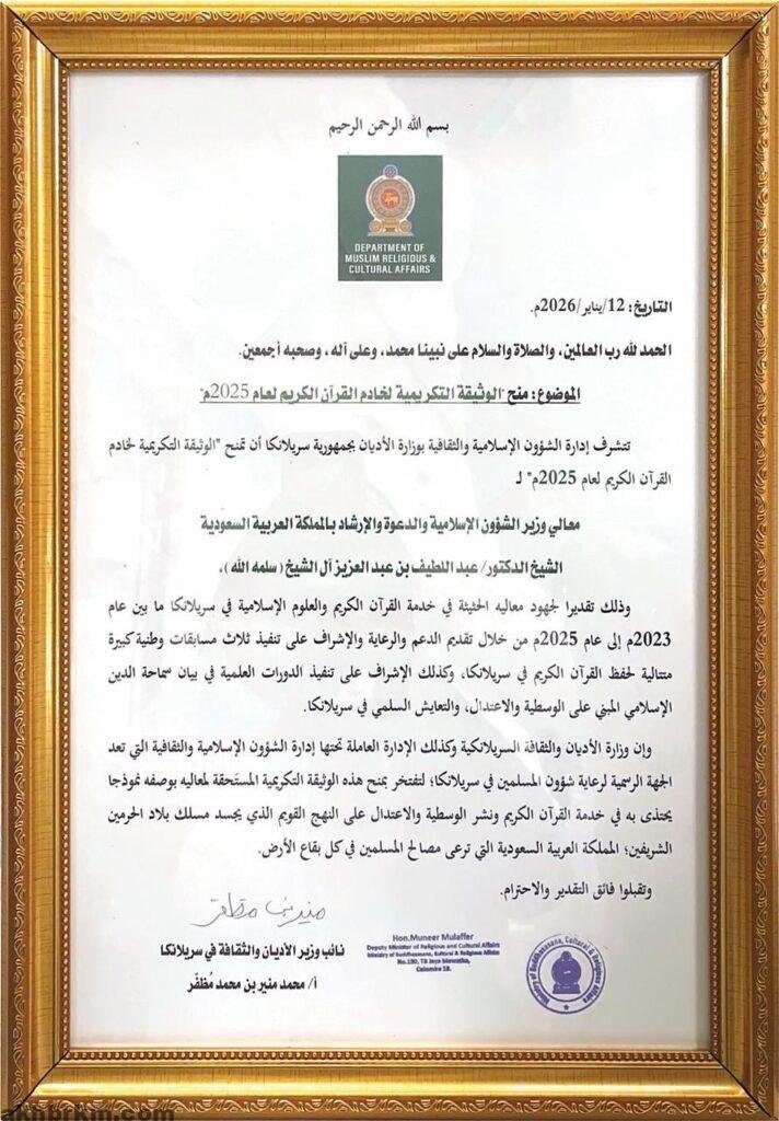 تُعدّ الوثيقة التكريمية الأولى من نوعها لتكريم شخصية خدمت القرآن الكريم وزارة شؤون الأديان والثقافة بجمهورية سريلانكا تمنح معالي وزير الشؤون الإسلامية الوثيقة التكريمية لخادم القرآن الكريم لعام 2025م