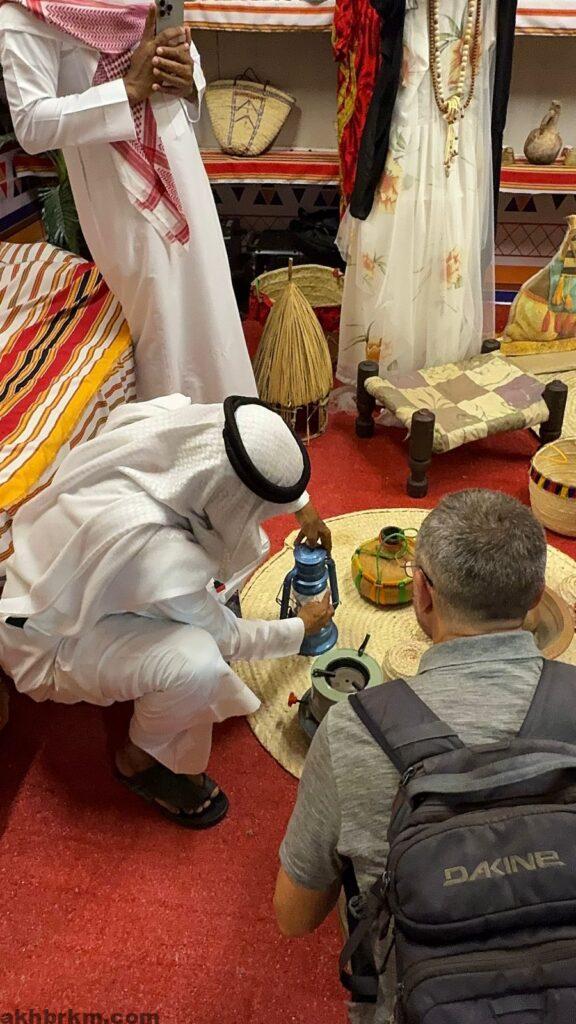 وخلال الجولة، قدم لهم شرحاً وافياً للسياح حول ما يحتويه الجناح من مقتنيات أثرية وموروثات شعبية تجسد هوية “صبيا” الضاربة في جذور التاريخ. وتعرف الوفد على الحرف اليدوية: التي اشتهرت بها المنطقة قديماً ولا تزال تحافظ على رواجها و الأزياء الشعبية والرقصات: التي تعكس التنوع الفلكلوري لأهالي المحافظة والعمارة التقليدية: وما يمثله الركن من محاكاة للبيت الصبياني القديم.