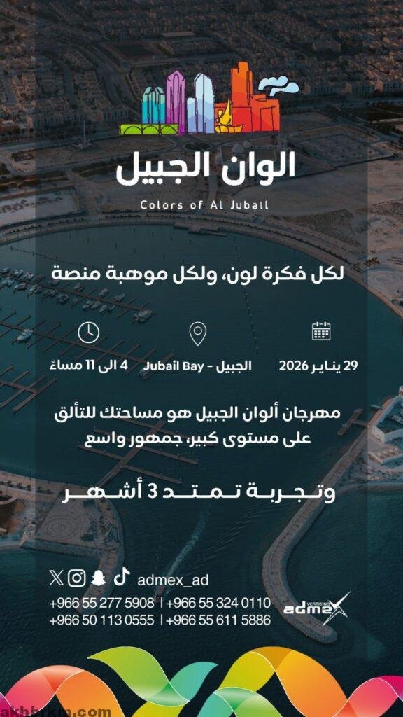 تستعد مدينة الجبيل لتعزيز مكانتها كوجهة سياحية رائدة في المنطقة الشرقية، مع إعلان شركة “ادمكس” (ADMEX) عن اختيار “مارينا الجبيل باي” مقراً لانطلاق مهرجانها المرتقب #مهرجانالوانالجبيل في 29 يناير الجاري. ويمثل المهرجان نموذجاً للفعاليات الحديثة التي تدمج بين الابتكار الفني والجاذبية الاستثمارية للمواقع البحرية، حيث تقرر أن تستمر فعالياته لمدة ثلاثة أشهر متواصلة.