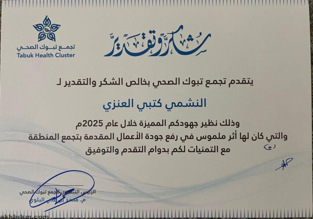 تجمع تبوك الصحي يكرّم النشمي كتبي العنزي تقديرًا لجهوده خلال عام 2025