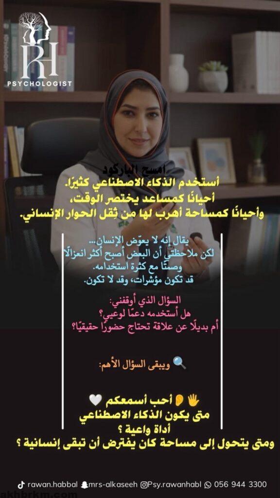 وفي هذا السياق، شاركت الأخصائية النفسية روان عبدالغني حبّال المجتمع طرحًا مهنيًا لافتًا، فتحت من خلاله باب التساؤل حول طبيعة العلاقة المتنامية بين الإنسان والتقنية، وأثرها على الوعي النفسي والتواصل الإنساني.
