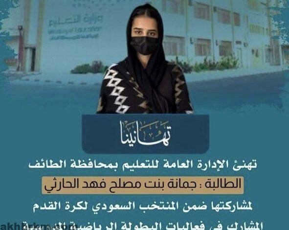 حققت الطالبة جمانة مصلح الحارثي إنجازًا رياضيًا لافتًا بعد اختيارها ضمن صفوف المنتخب السعودي لكرة القدم للسيدات المشارك في بطولة ولي العهد المقامة في مدينة عمّان بالمملكة الأردنية الهاشمية.