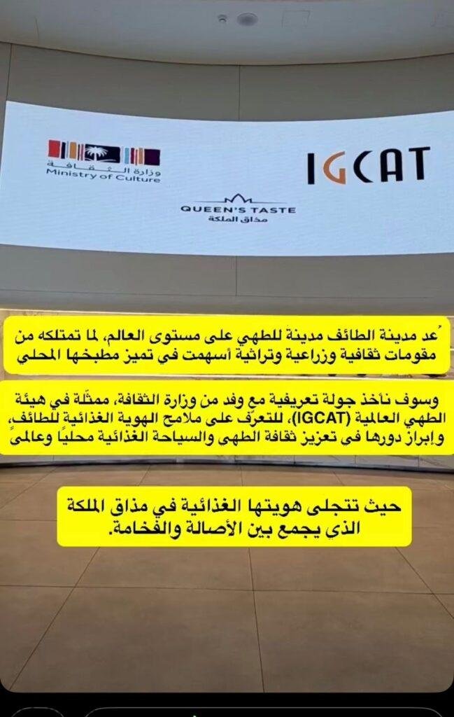 وفي هذا الإطار، تنظم جولة تعريفية بمشاركة وفد من وزارة الثقافة، ممثّلة في هيئة الطهي العالمية (IGCAT)، بهدف التعرف على ملامح الهوية الغذائية لمدينة الطائف، وتسليط الضوء على عناصر المطبخ المحلي، ودوره في تعزيز ثقافة الطهي ودعم السياحة الغذائية على المستويين المحلي والعالمي.