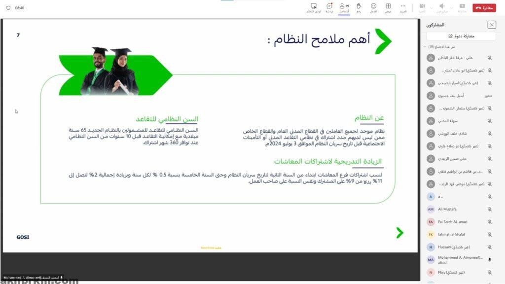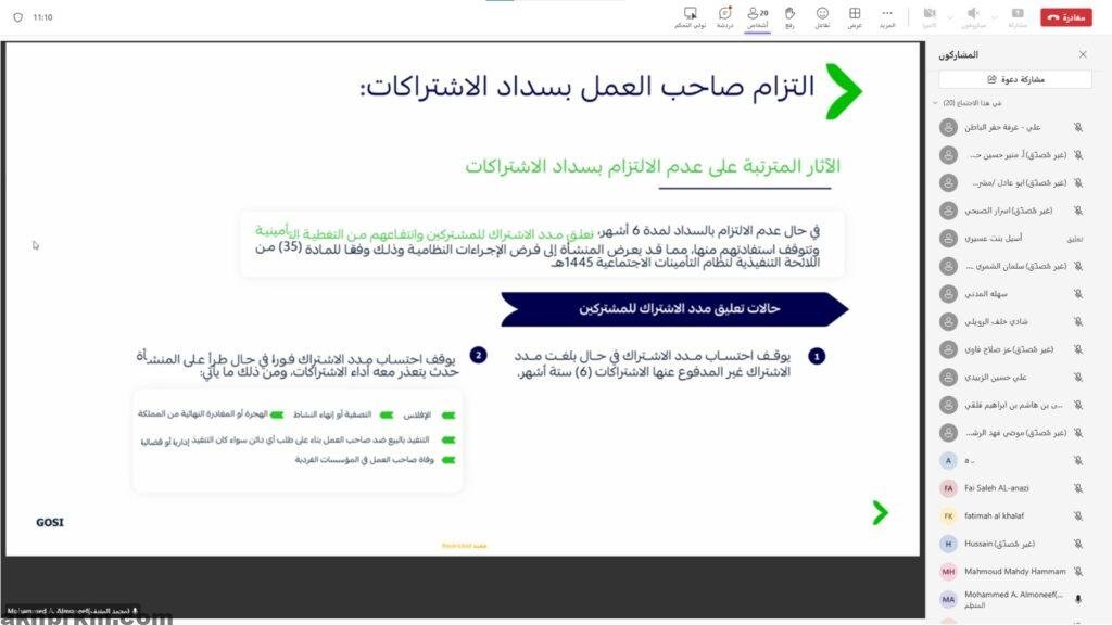 وفي ختام الورشة، أجاب المنيف على استفسارات المشاركين، موضحاً عدداً من الجوانب التنظيمية والحقوق والواجبات المتعلقة بالمشتركين وأصحاب العمل، بما يسهم في رفع مستوى الوعي بالأنظمة والمستجدات في مجال التأمينات الاجتماعية.