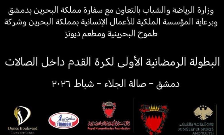 تنطلق يوم غدٍ الخميس منافسات البطولة الرمضانية الأولى لكرة الصالات في صالة الجلاء الرياضية بدمشق، بمشاركة 16 فريقاً، بتنظيم وزارة الرياضة والشباب السورية وبالتعاون مع سفارة مملكة البحرين، وإشراف الاتحاد السوري لكرة القدم، وبرعاية المؤسسة الملكية للأعمال الإنسانية وشركة طموح البحرينية، إلى جانب مجموعة ديونز.