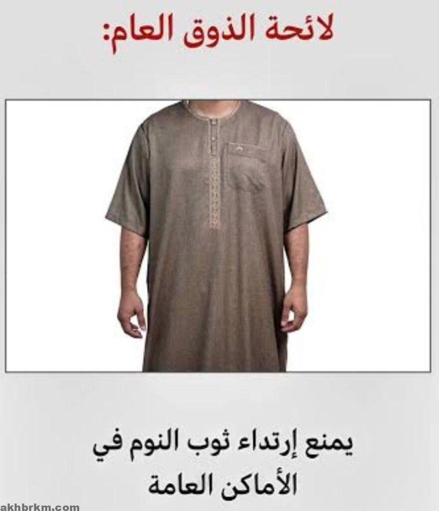 وقد صدرت لائحة المحافظة باحترام الذوق العام (بتوجيه من مجلس الوزراء عام 1440هـ/2019م)، تلزم الجميع (مواطنين ومقيمين وزوار) باحترام القيم والعادات والتقاليد السعودية في الأماكن العامة. تشمل المخالفات:
