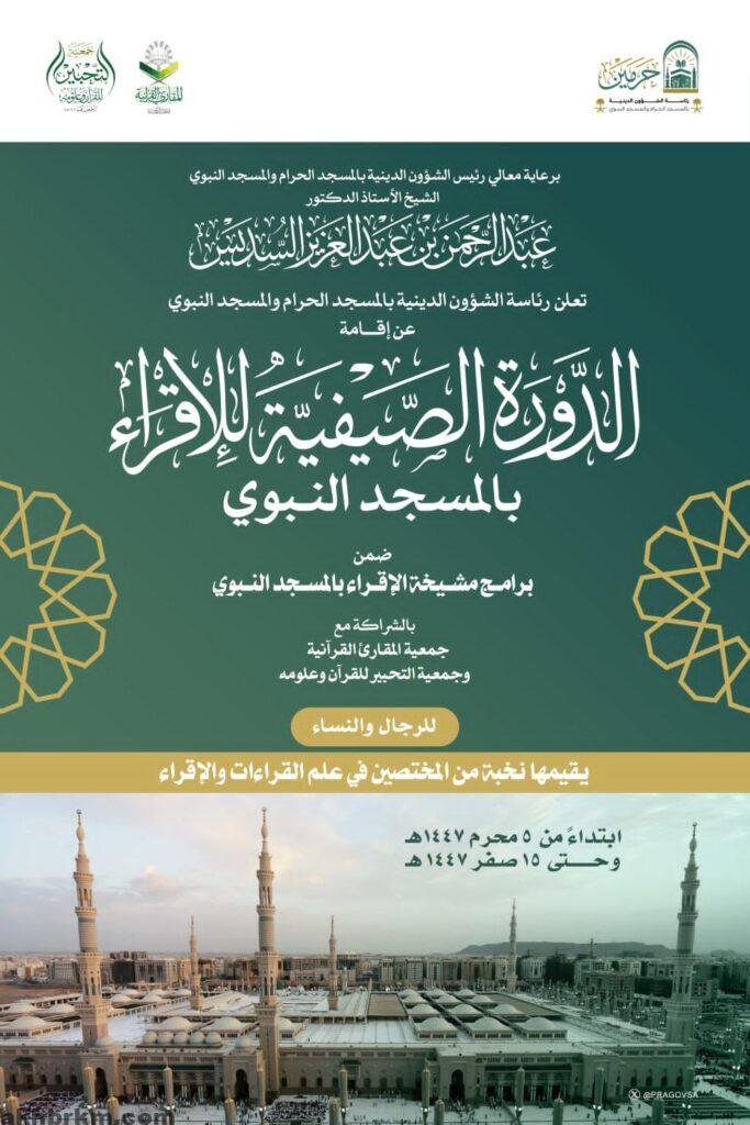 برعاية كريمة من معالي رئيس الشؤون الدينية بالمسجد الحرام والمسجد النبوي الشيخ الأستاذ الدكتور عبدالرحمن السديس، أعلنت رئاسة الشؤون الدينية إقامة الدورة الصيفية للإقراء في رحاب المسجد النبوي الشريف، المخصصة للرجال والنساء، ضمن برامج مشيخة الإقراء.