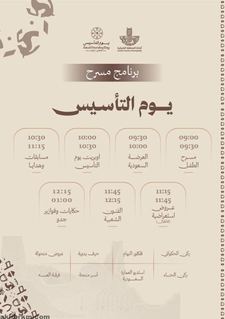 ويأتي برنامج يوم التأسيس بهوية وطنية تعبّر عن رمزية المناسبة، حيث يتضمن العرضة السعودية، وأوبريت يوم التأسيس، ومسرح الطفل، والعروض الاستعراضية، والفنون الشعبية، إلى جانب مسابقات وهدايا وحكايات وفوازير، إضافة إلى أركان ثقافية وتراثية، تشمل ركن الحكواتي، وركن الحناء، وفلكلور النهّام، واستديو العمارة السعودية، والحرف اليدوية، والعروض المتجولة، بما يعزز ارتباط الأجيال بتاريخهم الوطني ويجسد قيم الانتماء والفخر بالهوية السعودية.