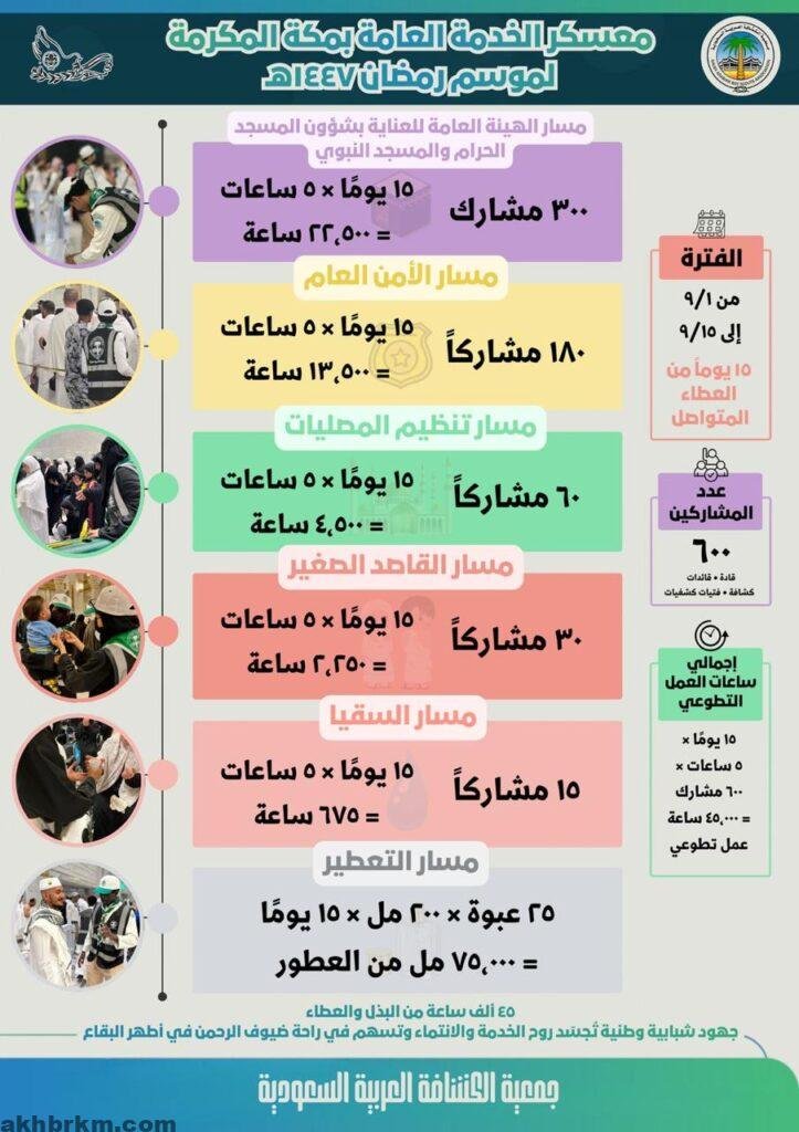 حقق الفتية والشباب والقادة الكشفيين والقائدات المشاركون في معسكر خدمة المعتمرين الذي تقيمه وتشرف عليه جمعية الكشافة العربية السعودية في الحرم المكي الشريف، أكثر من 45 ألف ساعة عمل تطوعية خلال النصف الأول من شهر رمضان المبارك، في إطار الجهود الوطنية لخدمة ضيوف الرحمن وتيسير أداء مناسكهم في أجواء من الطمأنينة والسكينة.