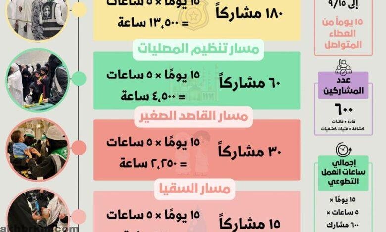 كما شارك 60 كشافاً في مسار تنظيم المصليات داخل المسجد الحرام وساحاته مسجلين 4,500 ساعة تطوعية، إلى جانب 30 كشافاً في مبادرة القاصد الصغير المعنية بالعناية بأطفال المعتمرين أثناء أداء ذويهم للنسك بإجمالي 2,250 ساعة تطوعية.