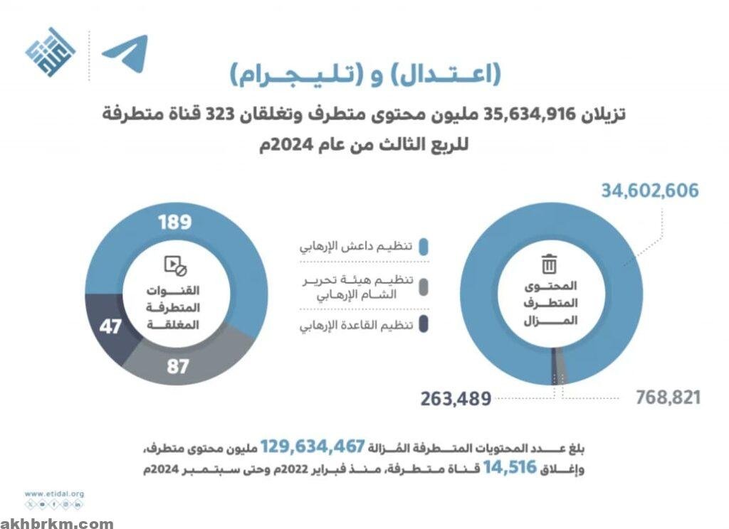 أزال المركز العالمي لمكافحة الفكر المتطرف “اعتدال” بالتعاون مع منصة “تليجرام”، 35.6 مليون محتوى متطرف وأغلق 323 قناة متطرفة، خلال الربع الثالث من العام الحالي 2024م.