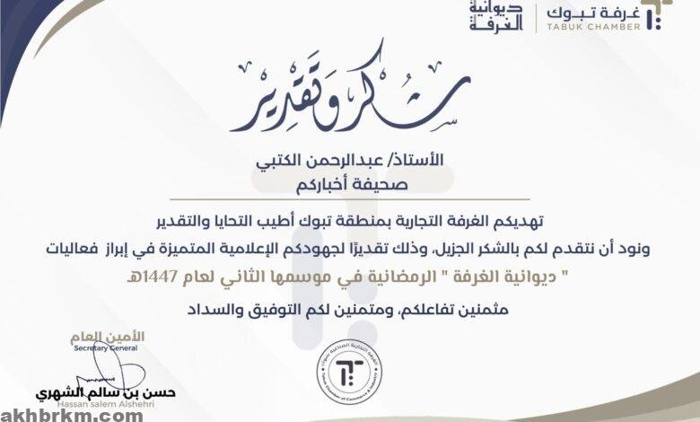 الغرفة التجارية بتبوك تكرّم صحيفة أخباركم الإعلامية تقديرًا لجهودها في تغطية ديوانية الغرفة الرمضانية