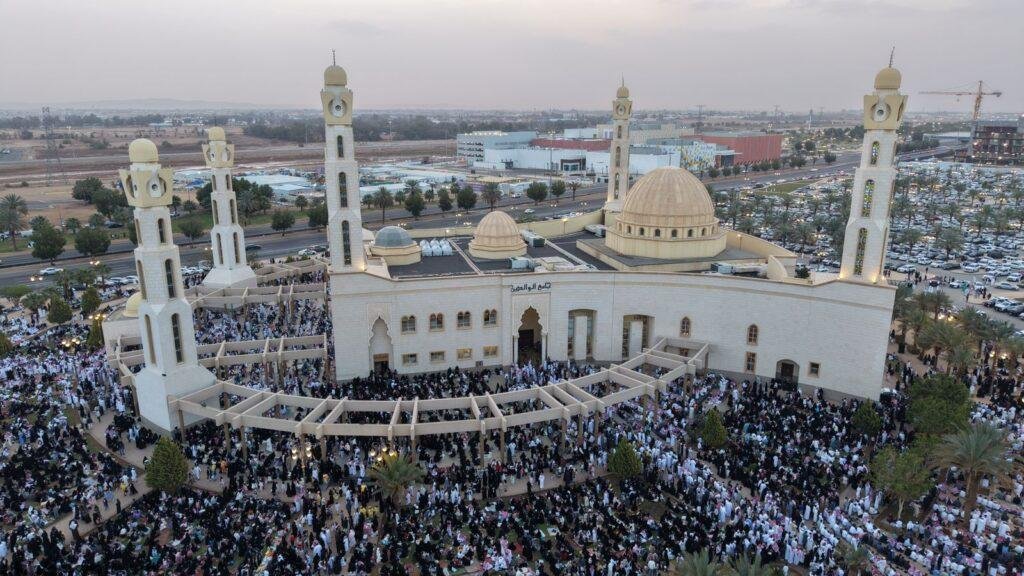 أدت جموع المصلين في مدينة تبوك اليوم صلاة عيد الفطر المبارك في جامع الوالدين، والتقطت صور جوية مبهرة تظهر جموع المصلين وسط الإبداع المعماري الذي يميز ساحاته وأروقته.