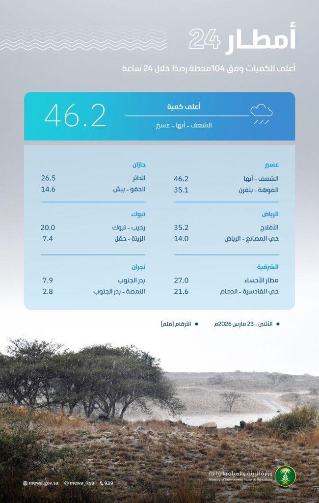 ووفقًا للتقرير اليومي لوزارة البيئة والمياه والزراعة حول رصد كميات هطول الأمطار في مناطق المملكة كافة؛ رصدت 104 محطات رصد هيدرولوجي ومناخي، خلال الأربع وعشرين ساعة الماضية، هطول أمطارٍ في مناطق (الرياض، مكة المكرمة، الشرقية، عسير، الحدود الشمالية، جازان، نجران، الباحة، والجوف).