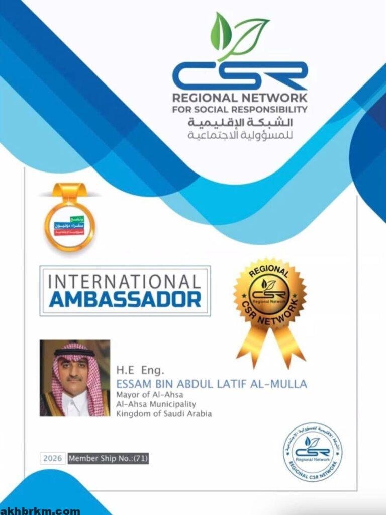 الشبكة الإقليمية للمسؤولية الاجتماعية تعيّن أمين الأحساء سفيرًا دوليًا للمسؤولية المجتمعية