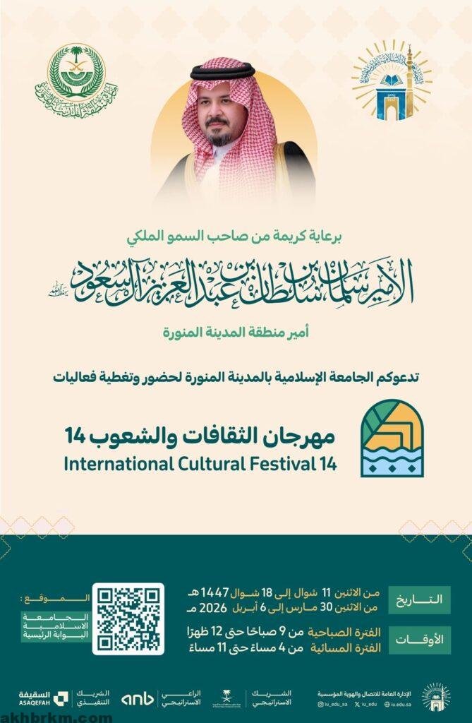 تستعد الجامعة الإسلامية بالمدينة المنورة لإطلاق فعاليات مهرجان الثقافات والشعوب الرابع عشر، برعاية كريمة من صاحب السمو الملكي الأمير سلمان بن سلطان بن عبدالعزيز ال سعود أمير منطقة المدينة المنورة، وذلك ضمن حدث ثقافي سنوي بات يحظى بحضور واسع واهتمام متزايد.