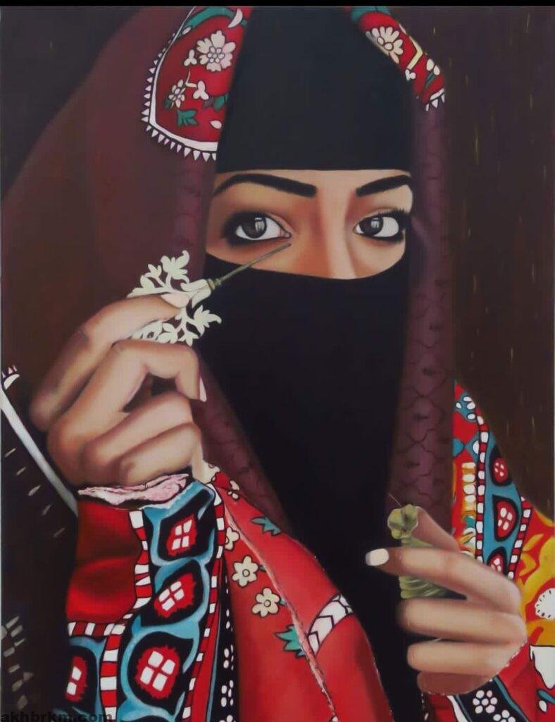 وجاءت اللوحة انعكاسًا لخبرة الظيفي في الرسم الزيتي إذ اعتمدت على تدرجات لونية دقيقة وتباينات ضوئية أبرزت ملامح الوجه والعيون بشكل لافت مع تركيز خاص على الكحل كعنصر جمالي وثقافي يعكس الهوية والتراث.