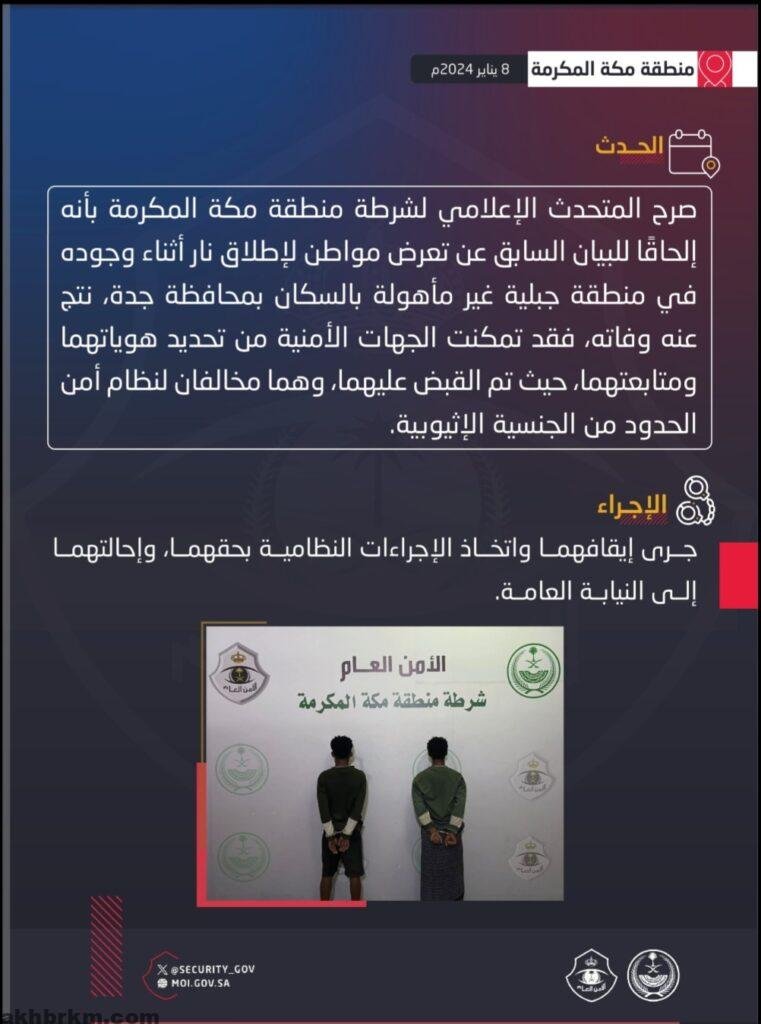 ألقت شرطة منطقة مكة المكرمة القبض على مخالفين لنظام أمن الحدود من الجنسية الإثيوبية لقتلهما مواطنًا بمحافظة جدة.