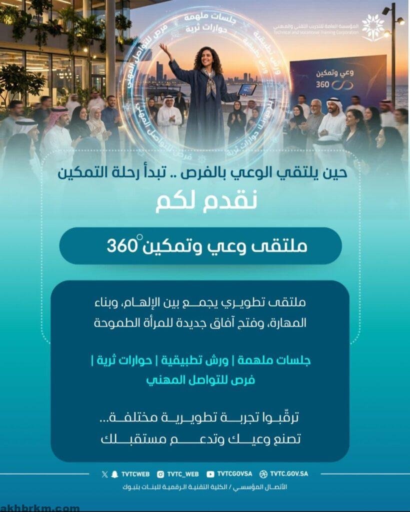 انطلقت اليوم الثلاثاء فعاليات ملتقى “وعي وتمكين 360” في الكلية التقنية الرقمية للبنات بتبوك، التابعة للمؤسسة العامة للتدريب التقني والمهني، وذلك على مسرح الكلية، خلال الفترة من الساعة 9:00 صباحًا وحتى 12:00 ظهرًا، بمشاركة نخبة من المختصات والخبراء في مجالات التطوير المهني وتمكين المرأة.