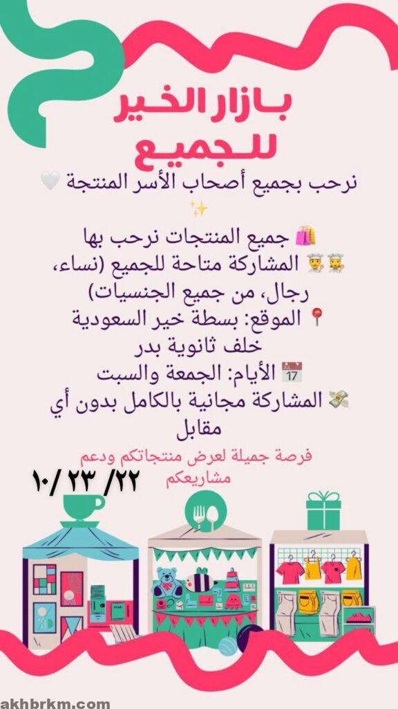وسيُقام البازار في موقع “بسطة خير السعودية” خلف ثانوية بدر، وذلك يومي الجمعة والسبت، حيث ستكون المشاركة مجانية بالكامل دون أي رسوم، مما يتيح فرصة مثالية للراغبين في عرض منتجاتهم والوصول إلى شريحة أوسع من الجمهور.