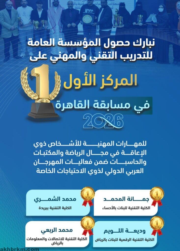 حصدت المؤسسة العامة للتدريب التقني والمهني المركز الأول في مسابقة القاهرة للمهارات المهنية 2026 للأشخاص ذوي الإعاقة، وذلك في مساري “المسابقات الرياضية” و”المكتبات والحاسبات”، ضمن فعاليات المهرجان العربي الدولي لذوي الاحتياجات الخاصة في نسخته السابعة، والمنعقد في الفترة من 28 مارس إلى 3 أبريل الجاري.