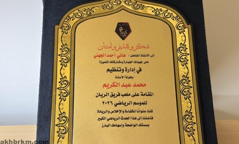 درع تقدير يكرّس الحضور الإعلامي… تكريم الإعلامي هاني الجهني في بطولة محمد عبد الكريم 2026