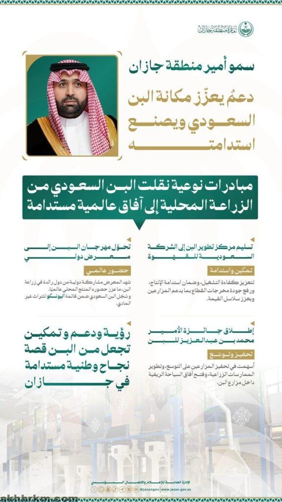 وجه صاحب السمو الملكي الأمير محمد بن عبدالعزيز بن محمد عبدالعزيز أمير منطقة جازان رئيس اللجنة الإشرافية للمكتب الإستراتيجي لتطوير المنطقة، باستكمال مسيرة النجاح التي حققتها مبادرة “أرامكو السعودية” في قطاع البن، التي من أبرز ثمارها إنشاء مركز تطوير البن السعودي، والعمل على تعزيز استدامته ورفع كفاءته التشغيلية، بما يضمن تعظيم أثره الاقتصادي والتنموي في المنطقة.