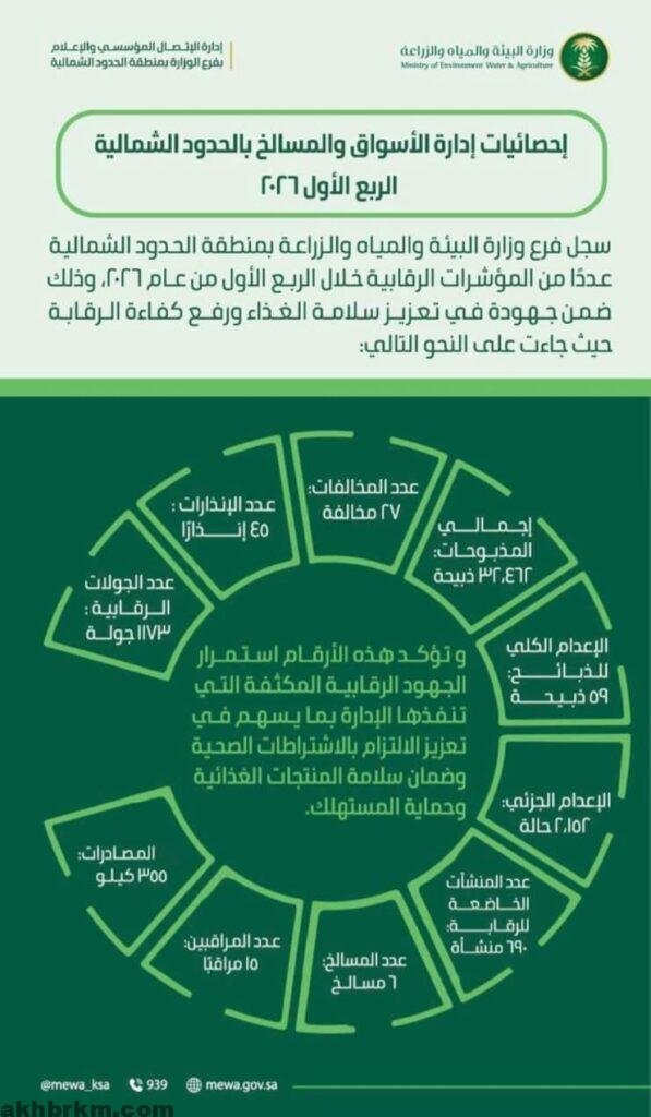 سجل فرع وزارة البيئة والمياه والزراعة بمنطقة الحدود الشمالية عددًا من المؤشرات الرقابية خلال الربع الأول من عام 2026، وذلك ضمن جهودة في تعزيز سلامة الغذاء ورفع كفاءة الرقابة، حيث جاءت على النحو التالي: