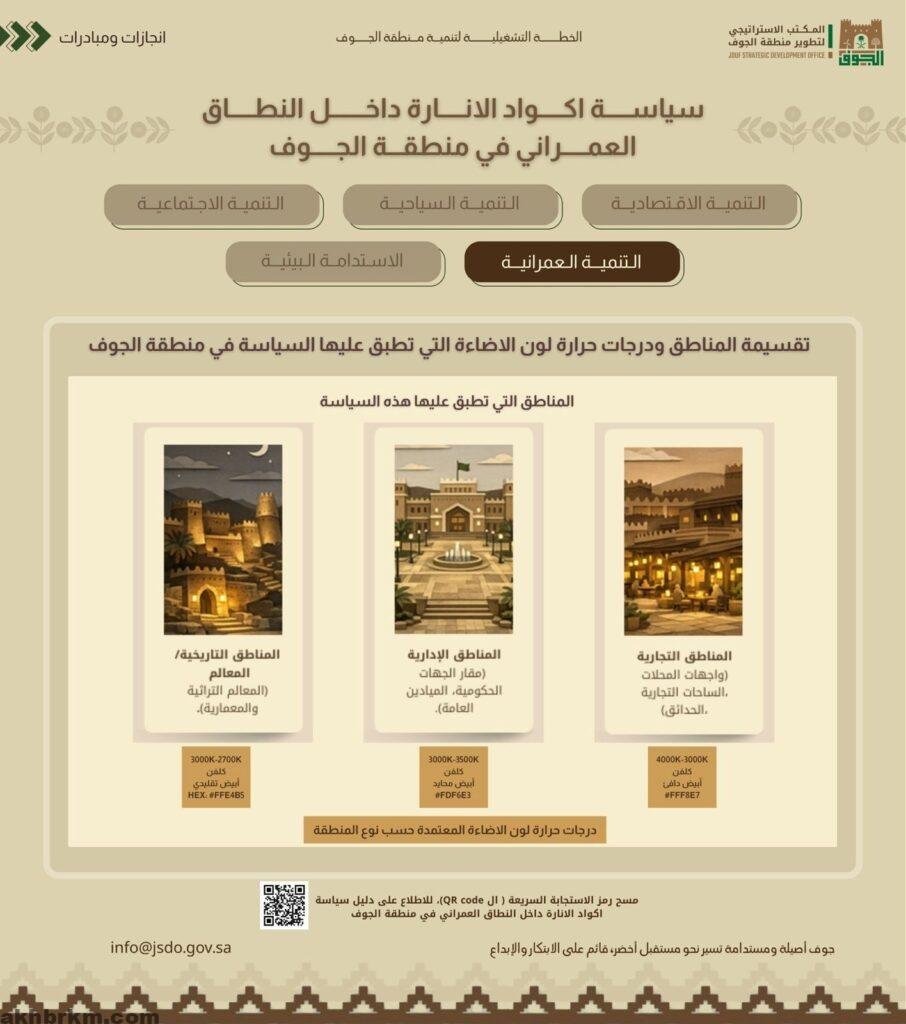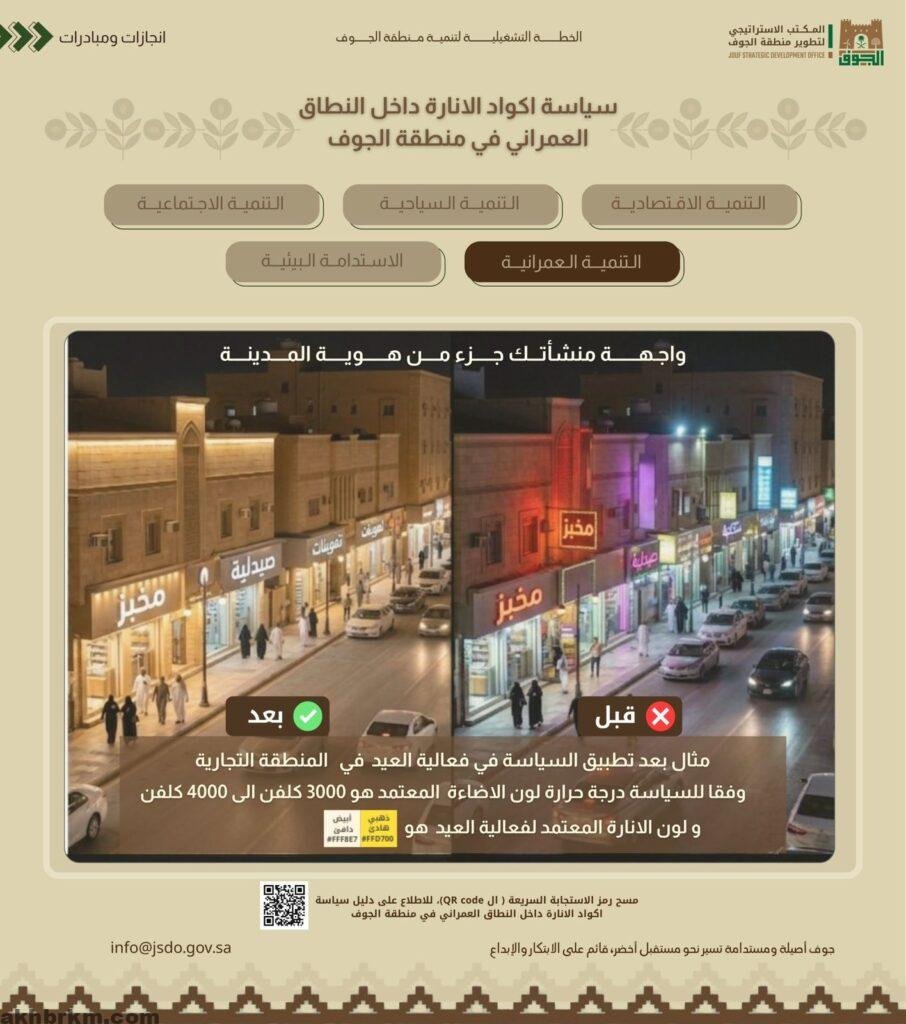 يواصل المكتب الاستراتيجي لتطوير منطقة الجوف جهوده التوعوية بسياسة أكواد الإنارة داخل النطاق العمراني في منطقة الجوف في إطار تعزيز المشهد الحضري وترسيخ الهوية البصرية للمنطقة.