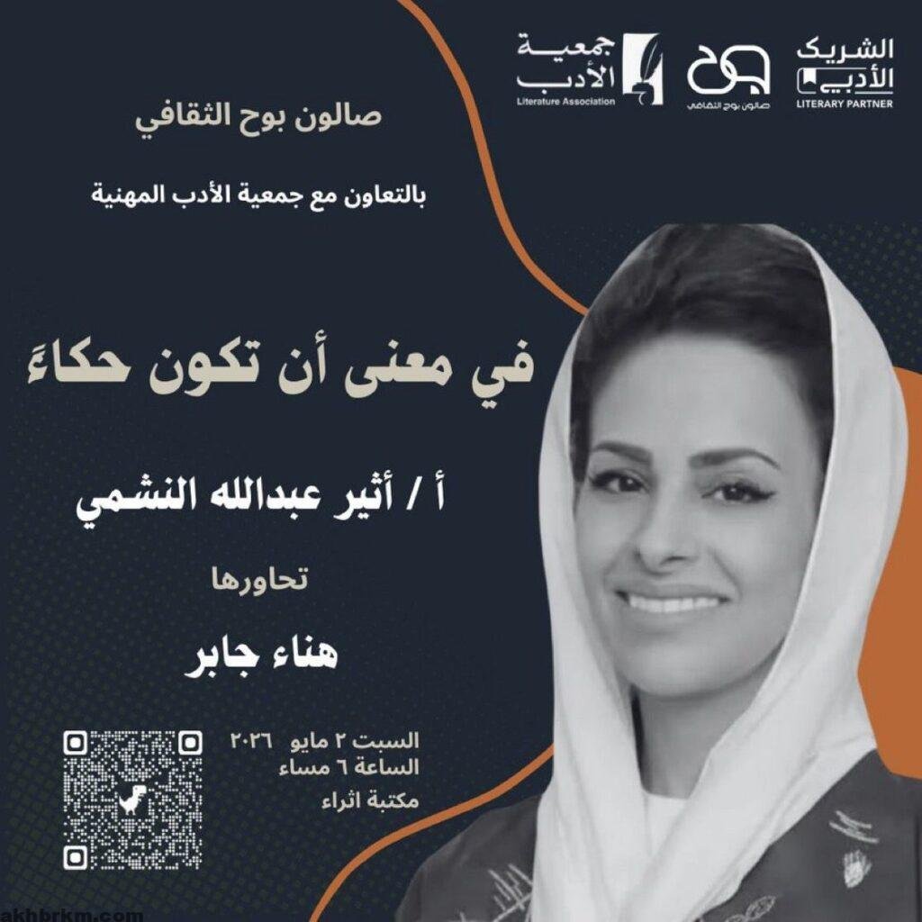 يستهل صالون بوح الثقافي فعالياته لشهر مايو 2026م، بتنظيم لقاء ثقافي بعنوان “في معنى أن تكون حكّاء”، بحضور الروائية القديرة الأستاذة أثير عبدالله النشمي، فيما تدير الحوار الكاتبة هناء جابر.