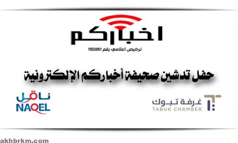بحضور لفيف من إعلاميين وأعلاميات منطقة تبوك وبدعم من الشيخ خالد بن اسماعيل البلوي مالك شركة ناقل والمهتمين بالحراك الإعلامي بالمنطقة تم تدشين صحيفة أخباركم الإلكترونية التي تعد رافداً مهما من روافد العمل الصحفي المميز وجزء من المنظومة الإعلامية المتكاملة والمكملة لجهود القطاعات المختلفة في تحقيق رؤية المملكة 2030 ،
