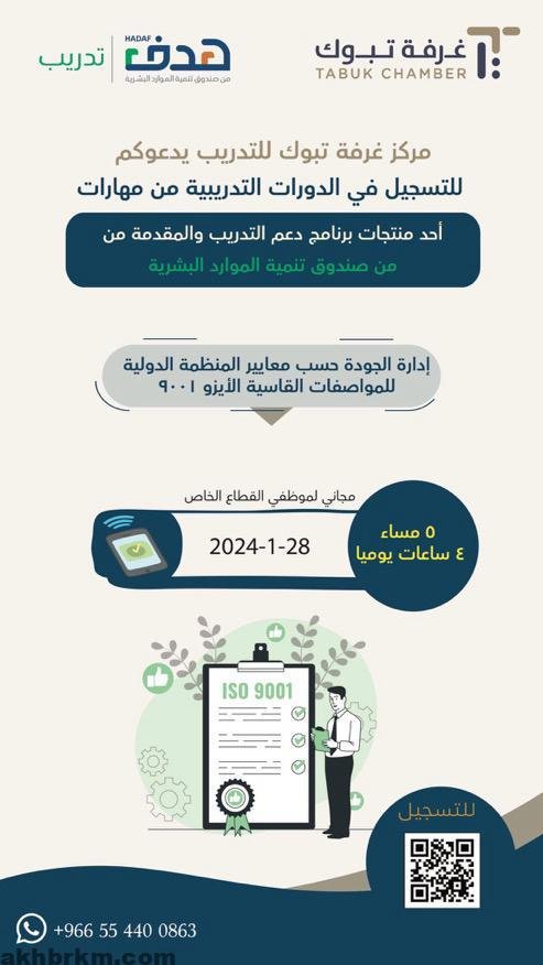 نظمت الغرفة التجارية بمنطقة تبوك دورات مجانيه لموظفي القطاع الخاص بالتعاون مع صندوق تنمية الموارد البشرية “هدف” بشهادة معتمدة من المؤسسة العامة للتدريب التقني والمهني لتسهدف عدداً من أبناء المنطقه من الجنسين بالمنطقة.