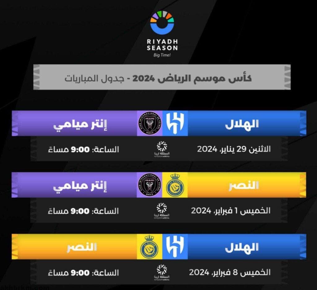 وبمشاركة النصر والهلال وستقام البطولة بنظام النقاط ، ويتراقب العالم لقاء النصر بقيادة الأسطورة رونالدو أمام ميامي بقيادة ميسي في لقاء سمي بـ “الرقصة الأخيرة” في الأول من فبراير ،
