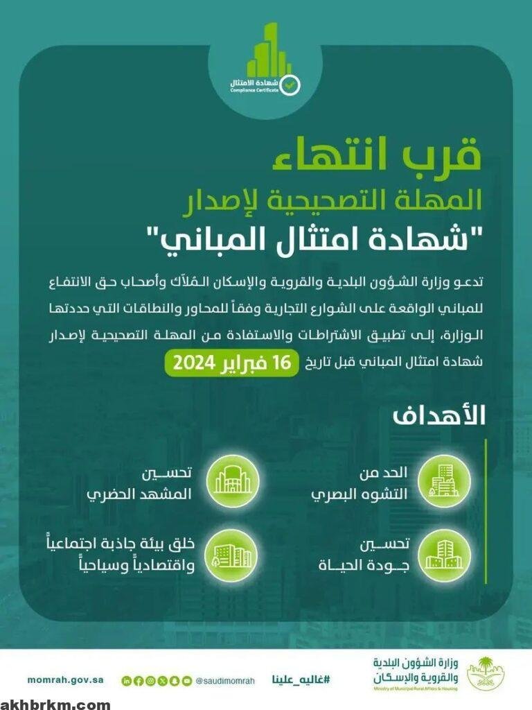 أعلنت وزارة الشؤون البلدية والقروية والإسكان , عن قُرب انتهاء المهلة التصحيحية لإصدار “شهادة امتثال المباني”، التي تضمن التزام ملاك المباني الواقعة على الشوارع المستهدفة وأصحاب حق الانتفاع، بمعالجة وخلو مبانيهم من عناصر التشوه البصري، لتوفير بيئة عمرانية صحية ومستدامة والارتقاء بالمشهد الحضري في المدن السعودية وتحسين جودة الحياة.