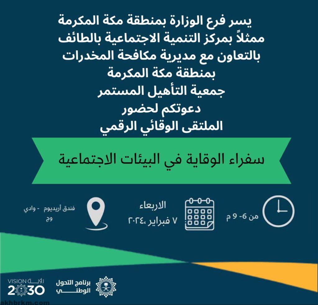 أعلن فرع وزارة التنمية الاجتماعية والموارد البشرية بالطائف بالتعاون مع مديرية مكافحة المخدرات بمنطقة مكة المكرمة جمعية التأهيل المستمر لـ الملتقى الوقائي الرقمي (سفراء الوقاية في البيئات الاجتماعية) .