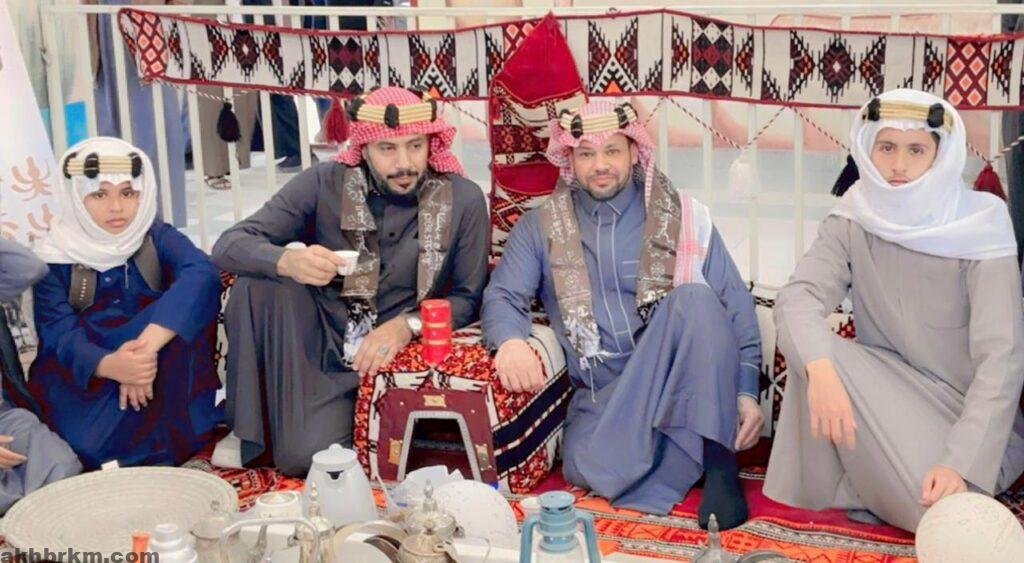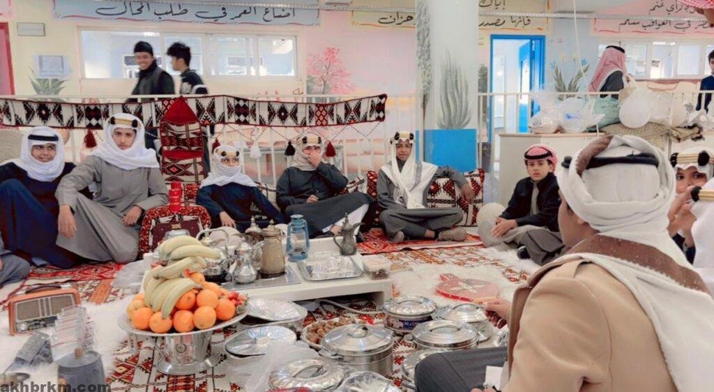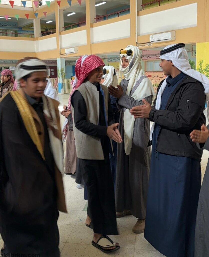 علي أنغام الأغاني الوطنية حيث ادى بعض المعلمين مع الطلاب الذين تزينو بالملابس التراثية التي تعبر عن الأصالة. العرضة السعوديه وسط تفاعل ومشاركة بعض الطلاب ورائد النشاط الطلابي بثانوية ابي موسي الأشعري الاستاذ/سالم العطوي .